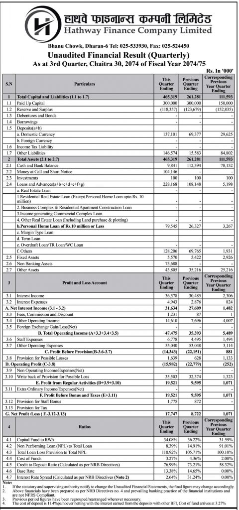 हाथवे फाइनान्सको तेस्रो त्रैमासिक विवरण सार्वजनिक